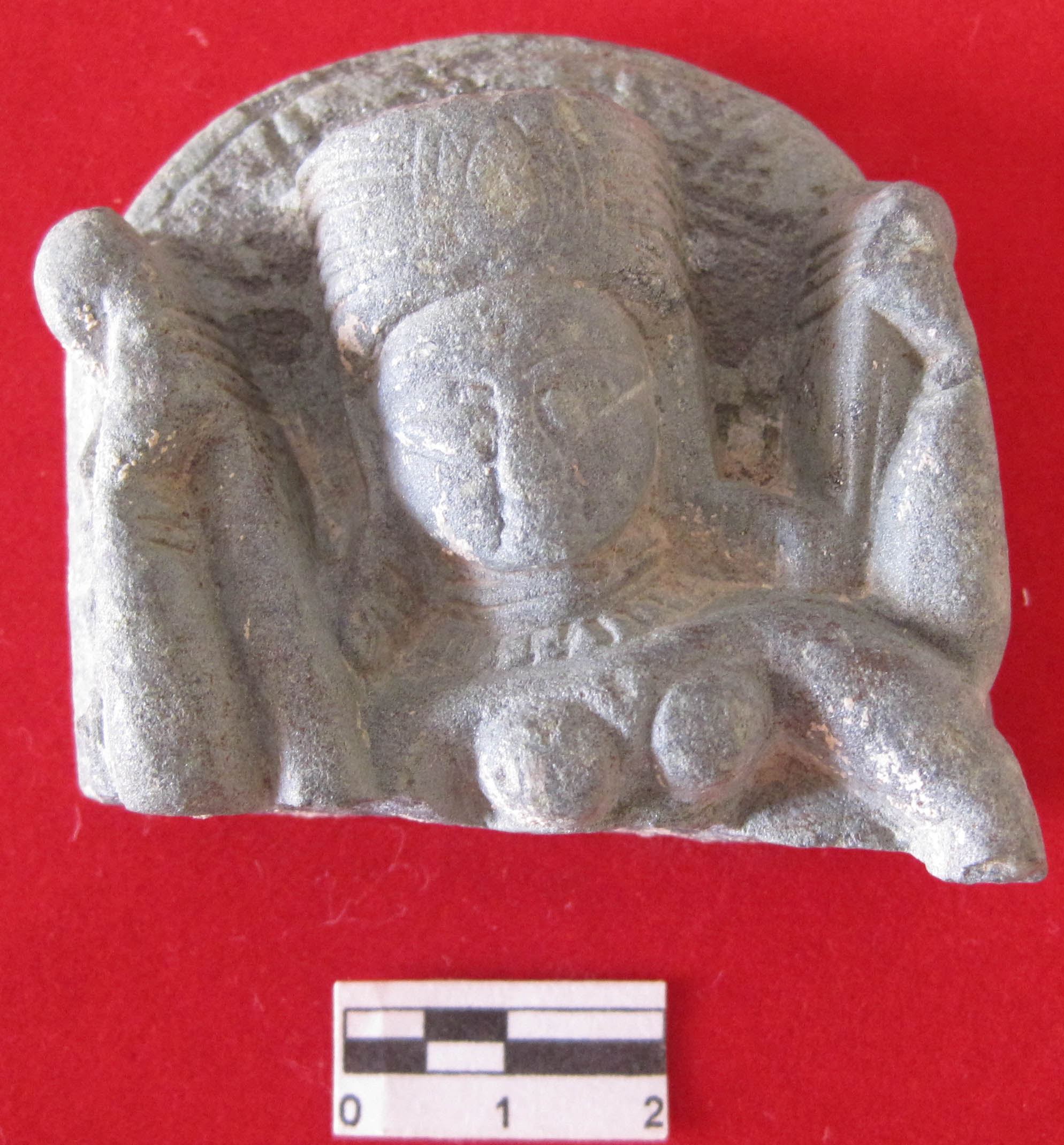 Broken image of Sarasavti four hand sculpture right hand is holding Veena and left hand is most probably book, while left lower one is broken from arm, she wear necklace, eye brow shown with relief.