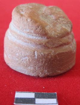 Circular flat base with incised line design around body