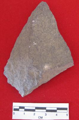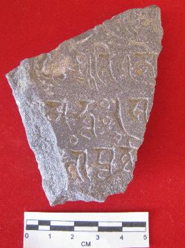 Broken four line inscription with Devnagri corrector letter engraved on smooth surface.