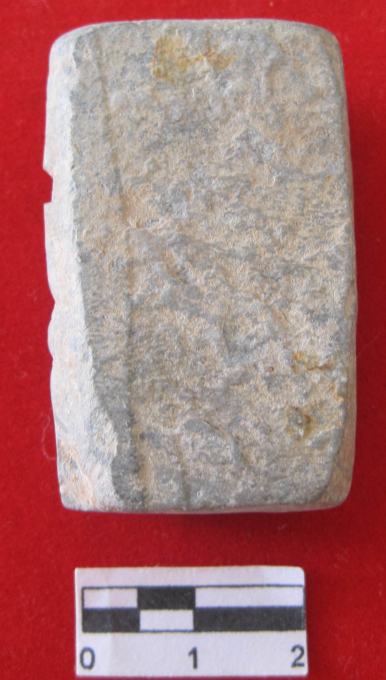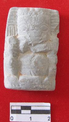 Small stone plaque depecting Ganesha Seated in Latitashan posture two hands figure, head is decorated with dotts design. Left hand is not clear while right hand is holding some object