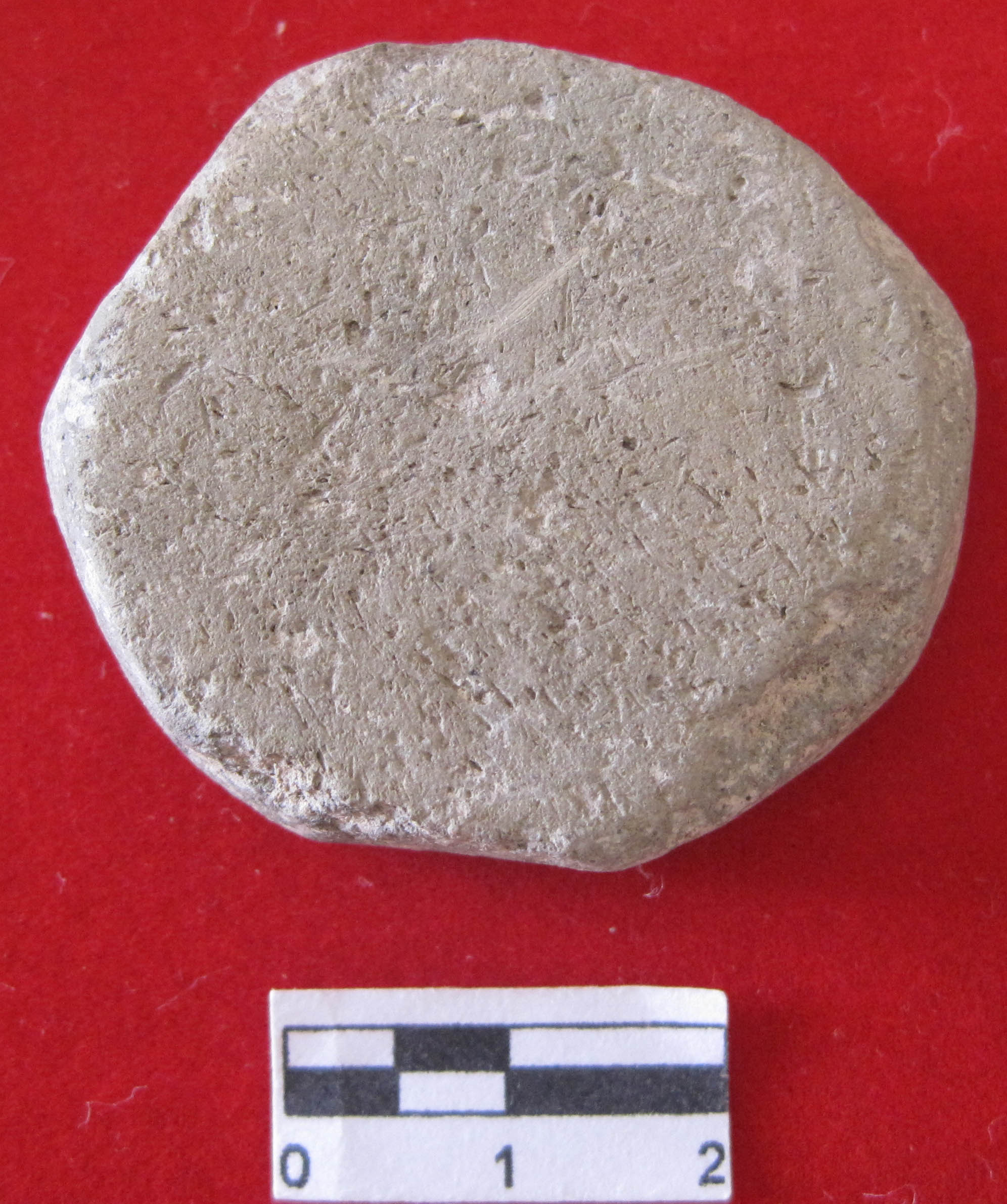 Semi circular made out of mica contentsdull red ware pot sherd.