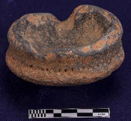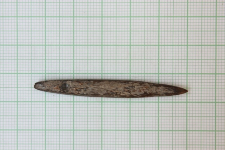The partly damaged needle is prepared either from an antler or rib bone of deer is round on all sides. Subsequent grinding is done at the top to make it a short sharp pointed edge.The surface of the needle is highly polished with a circular perforation near the butt end.