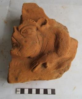 Animal figure. It has wide open mouth partly broken, eye with eyebrow and small ear. Neck is marked by three semi- circular lines. Left front leg is visible with all 5 fingers. Body is missing. Above the eye there is a circular dots at the edge.