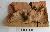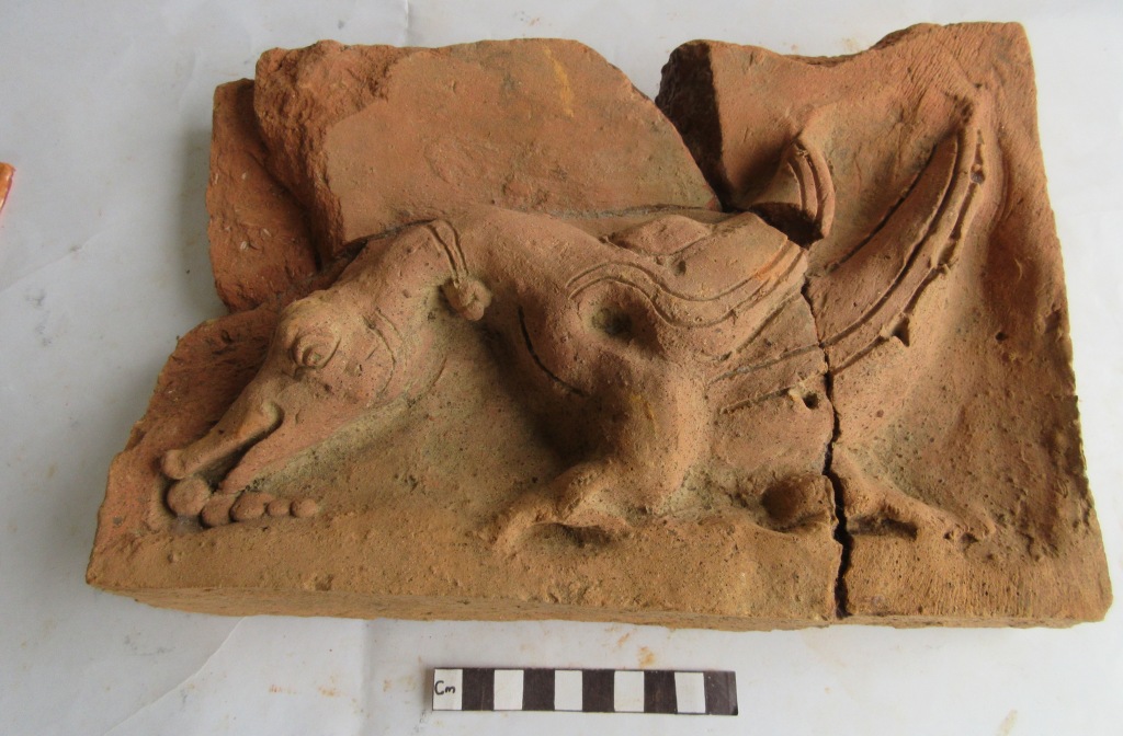 Swan figure shown as trying to pick some object by its mouth from the ground. It has open mouth and one eye. Pendant is shown in the neck. Left leg is placed on the front and right leg is in the back. There are five round pebbles on the ground. One of the pebble is shown between the beak.