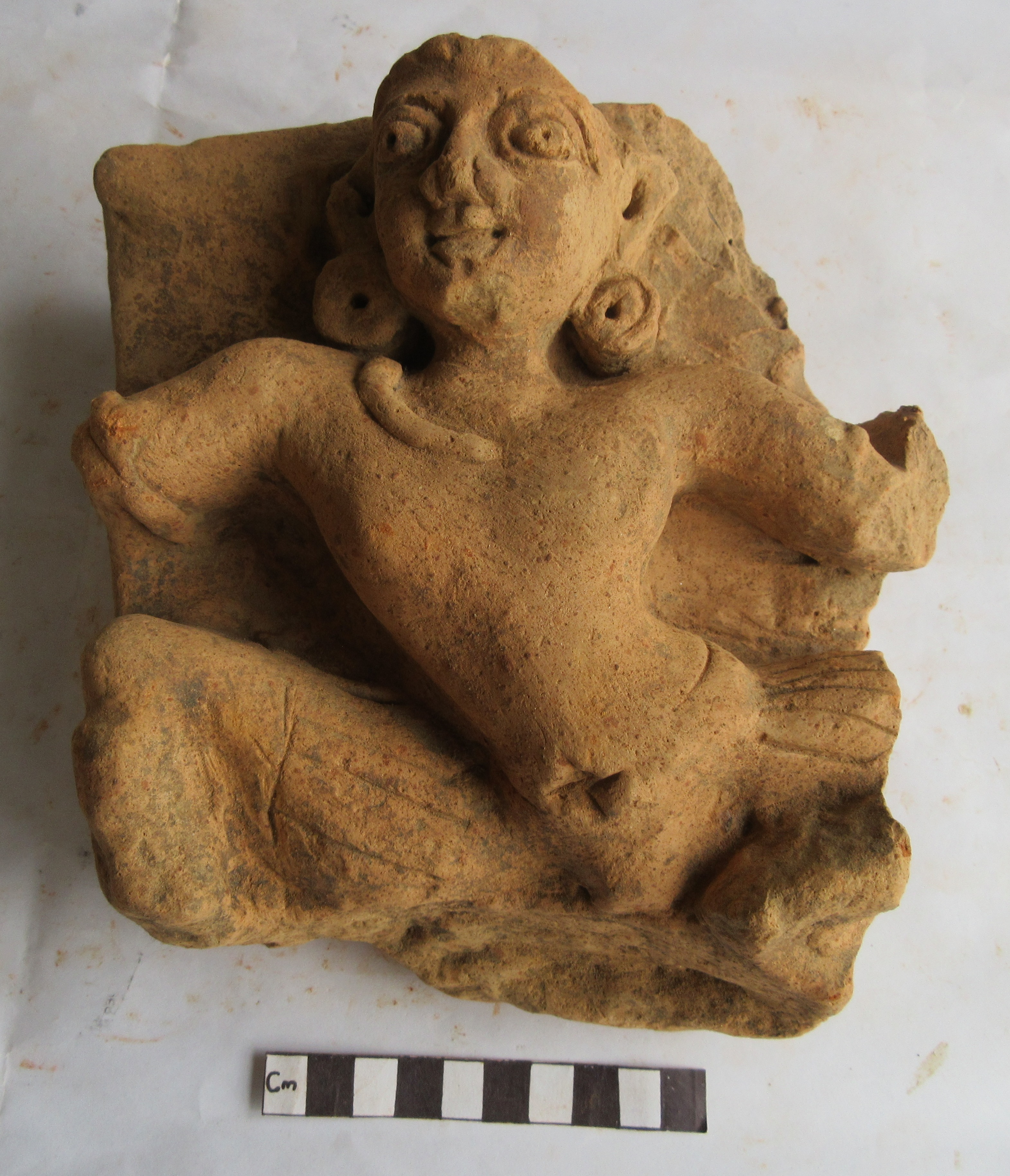 Male figure is shown in sitting position. It has wide open eyes with eyebrow, nose and lip showing smiling face. He wears kundala on both ears and necklace on the neck. Both half of the hands are broken. Missing the both legs. The belly button is shown as deep depression. Half of the necklace is broken.