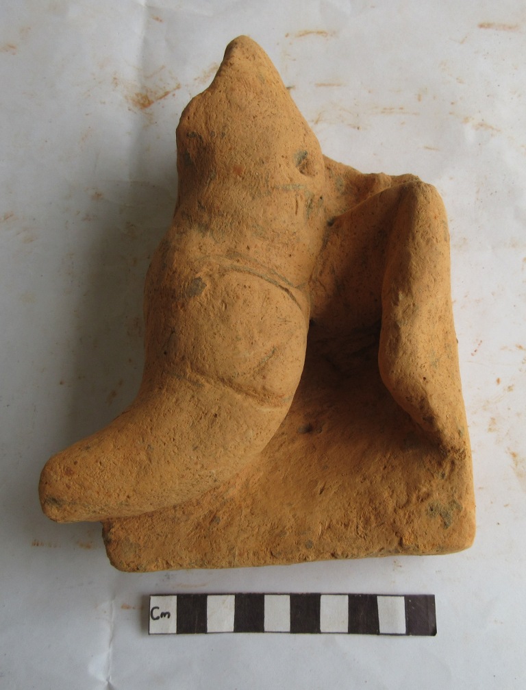 Human thigh upto knee and belly portion is depicted. Right thigh is shown bending kneel down. Part of the left leg is shown in front of the thigh. Hands and upper body above the belly is missing. There is a clear marked of belly button.