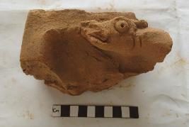 Swan head figure. It has a big circular projected eye and broken mouth. All the body part is missing. Two incision mark on the neck.
