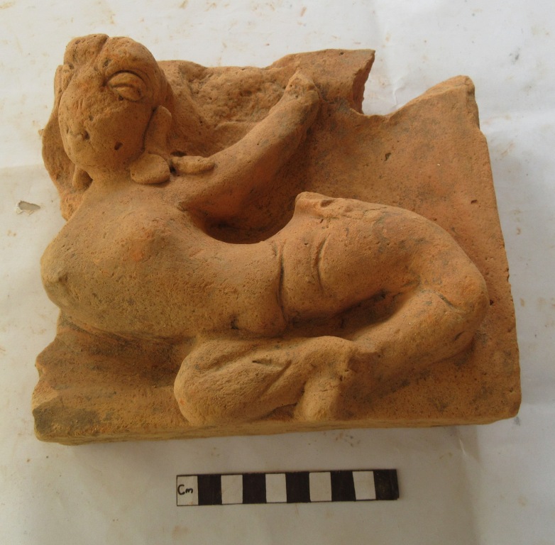 Male figure with bending position. It has two close eyes, nose and mouth is broken. He wears kundala on both ears. His left hand is raised and right hand is missing. Both the legs are bending. A right foot is placed over the left feet.There is pointed projection on the upper part of left thigh.