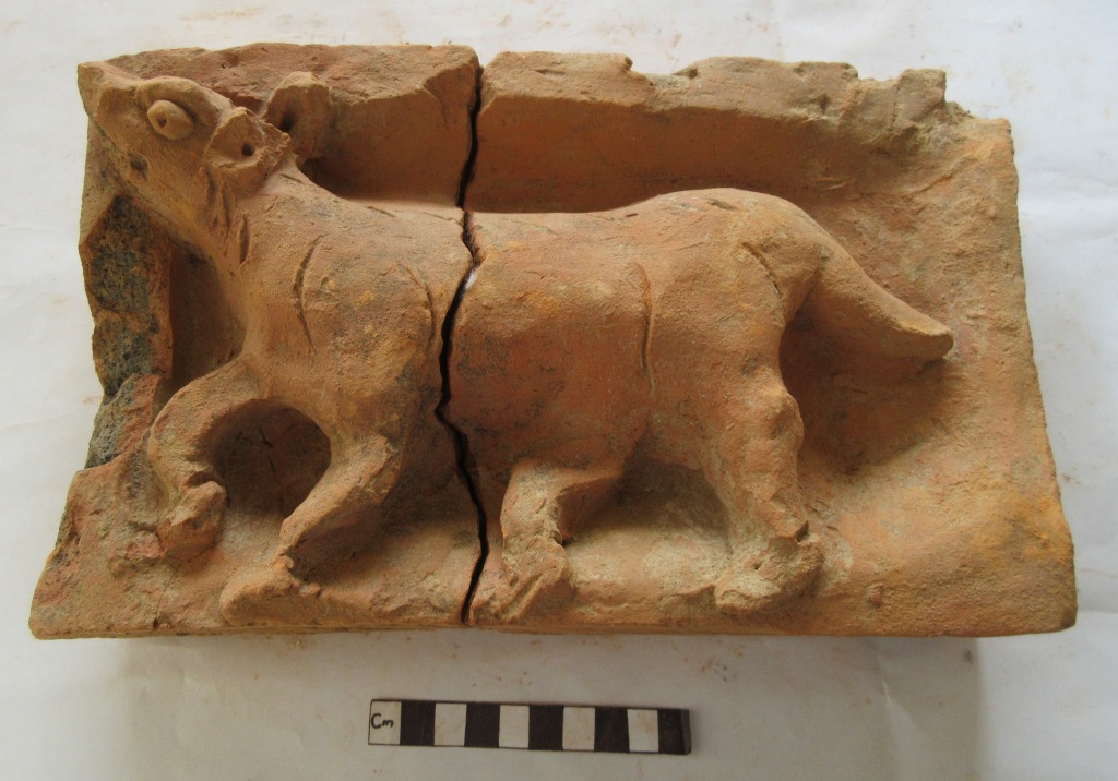 Jackal figure. It has projected eye, two pointed ears, part of nose and mouth is broken. Its four legs are clearly visible with tail hanging backward. Its front right leg is bending and raised on the front. Both the left front leg and right hind leg is slightly bending. The hind left leg is placed straight on the ground. The spaces between the front two legs are shown as circular depression.