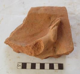 Hand portion of human figure. Palm is put upright and facing left side. Four fingers are visible on the hand.