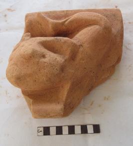 Human flying figure. Head, right hand and right leg is missing. The body is shown horizontally, part of left hand is broken, left leg is bending up above the body.