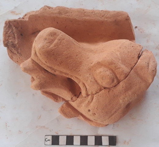 Animal head figure. It has projected eye, long snout and round in the end. Its mouth is open. The body part is missing.