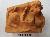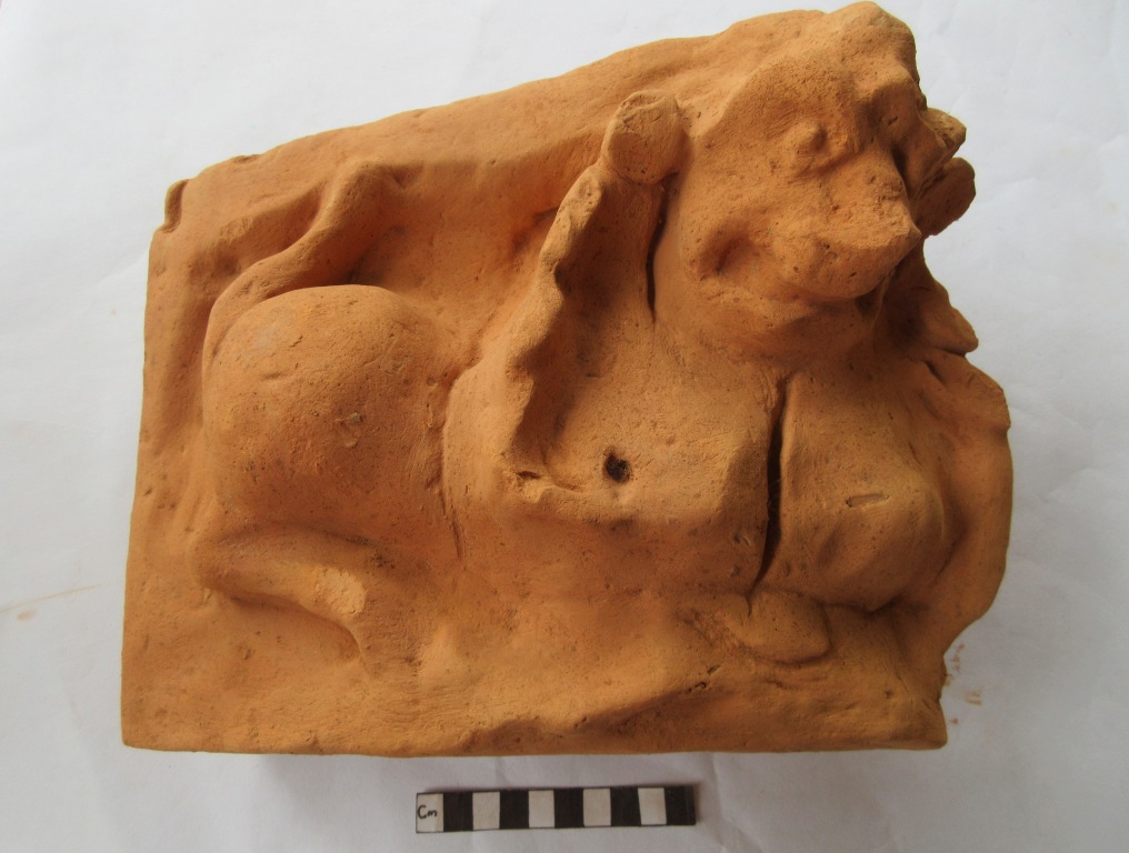 Crouching Lion figure. It has small projected eye, two ears and open mouth. Nose is broken. Mane covers the shoulder. Tail is raised, pointing to the sky. There is a deep line depression on the chest.