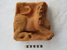 Lion body facing left direction. Head portion is missing. The figure is shown in squatting position, only one front and one hind leg is visible. Mane cover the shoulder part, tail is raised up and pointing backwards. Part of hind part is broken.