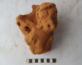 Human figure head position . The figure has a smiling face, two eyes, nose and Tilak vertical mark on the forehead. He wears kundala on right ear.
