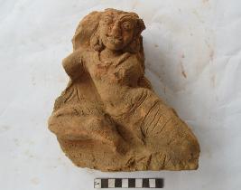 Human figurine with smiling face, kundala on both ears and necklace is on the neck. Both hands are missing. Right legis folding in the front and left leg is place behind, up to knee portion is shown on the left leg. Pendant is broken