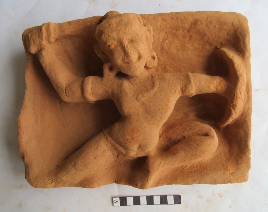 Warrior figurine. He holds armour shield on the left hand and sword on the right hand. The figure wears kundala on both ears and necklace on the neck. Two arms bands on both hands. His left leg is folded and right leg is slanting to the right side
