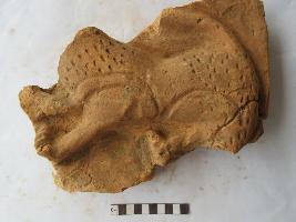 Tiger body. Head, part of font right leg and hind legs are missing. Tail is broken. Body is marked over by dots. There are two semicircular depression on the lower part of the body.