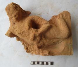 Flying figurine. Face is mutilated, right hand is missing. Left hand is placed on the waist. Left leg is raised back.There is no depiction of right leg.