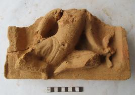 Human figurine in sitting position. His head is missing. Right hand resting on right thigh and partly broken, left hand holds stick. Both legs are folding. He wear drapery, covering bot the thigh part. His left knee is broken.