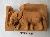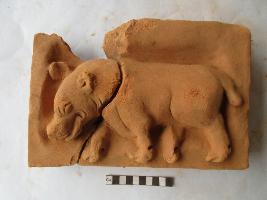 Pig figurine. The figure has grinning face, one close eye and two pointed ears.All the four legs with hoof and tail is clearly visible. The pig is shown moving to the left direction. Both the right legs are placing forward and left legs are straight standing on the ground.