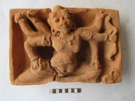 Six hands human figurine. He has a projected eye, bearded face probably Brahma and ornamented necklace on the neck. He wears kundala on both ears. His hair is knotted on the top of head. Right lower hand holding sword, two upper hands are raised up and holding unknown object. The left lower hand resting on knee, middle hand holds bow, the upper most one raised up. He wears armband on both sides and bangles on the hands.