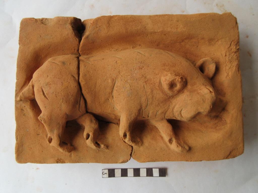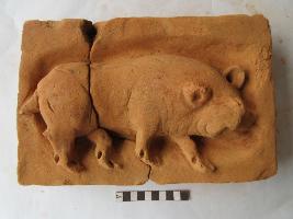 Pig figure. It has projected ears, four legs with hoofs and short tail. It has a bulky body. Part of head is broken. The pig faces right direction. Its body is covered with incised mark on the back and neck part.