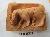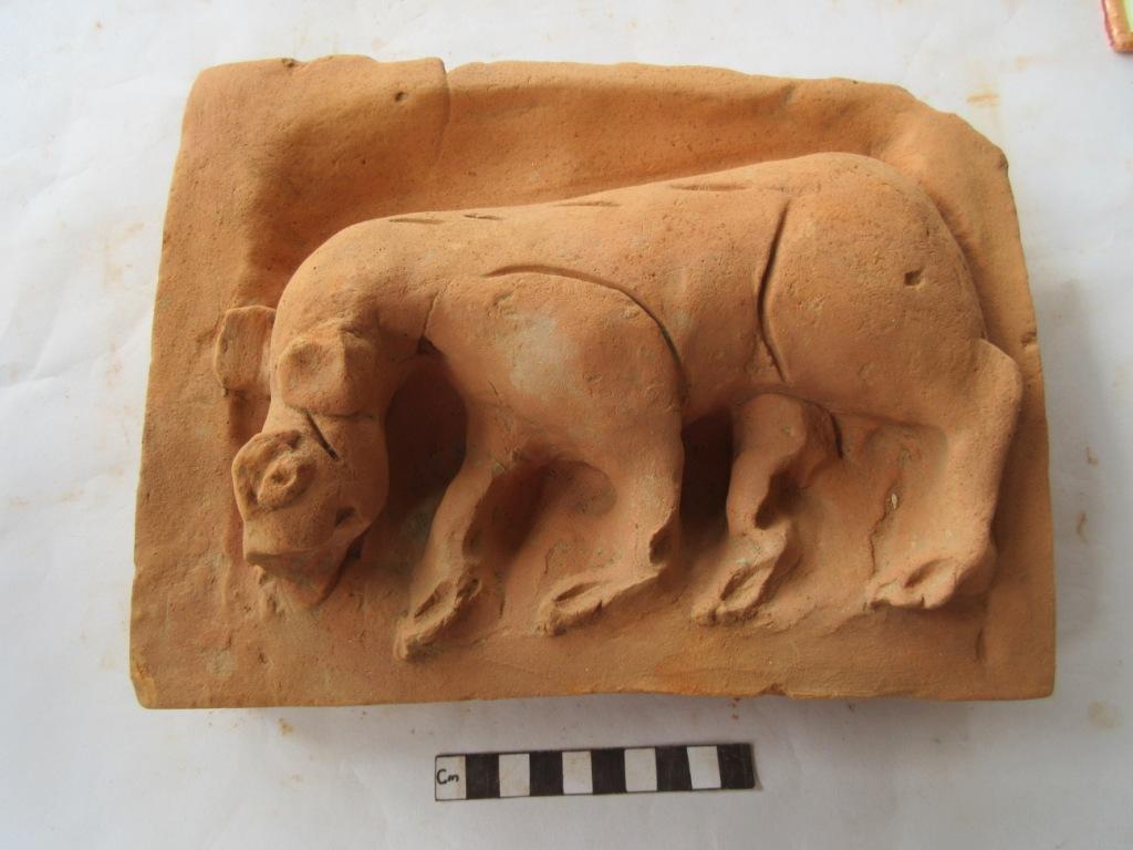 Rhino figurine. It has a projected eye, big ears, mouth is broken. Head is facing down to the ground. It has a muscular body, four legs with hoofs.