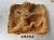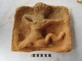 A depiction of human figurine. The figure has round head. There is no depiction of eye, nose and mouth. Head is decorating with vertical incision mark. He wear necklace on the neck. His right hand is folded and resting on the side of the right chest. Left hand is spreading out straightly to the left. His right leg is bending, knee touched the ground and lower leg part is raised up. Left leg is depicted as waving. The figure is in crude form.
