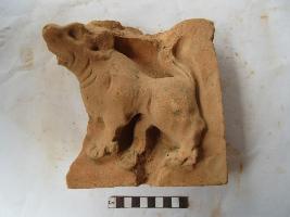 A depiction of roaring tiger. The lion faces right direction. It opens its mouth, having a deep depression eye and projected ear. It has a muscular body and three legs with toe. Its right front leg is missing. Tail is raised up. Chest is decorated with three incised lines.