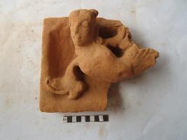 A depiction of human face and bird wings. It has big eyes, broken nose and smiling face. He wears kundala on both ears. Lower body part is missing.