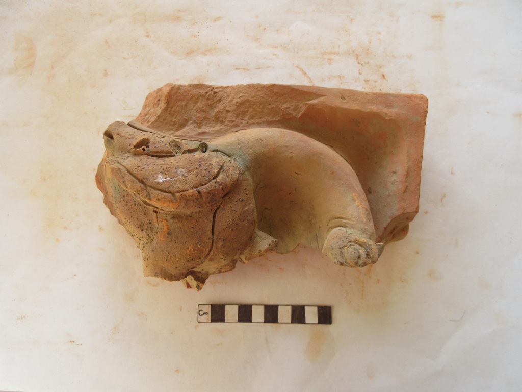 A depiction of bird figure body with long neck. Its head, legs, tail and part of body is mossing.