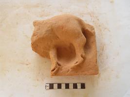 A depiction of animal figure. Only hind part, two hind legs with hoofs and tail is visible. Front body of the animal is missing.