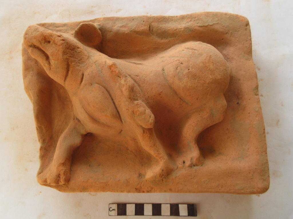 A depiction of animal figure, having a muscular body. It has round eye, mouth and big right ear. Right front leg move forward and left front leg is hold back. It has ne hind leg, which is slightly bending. Left ear is broken.