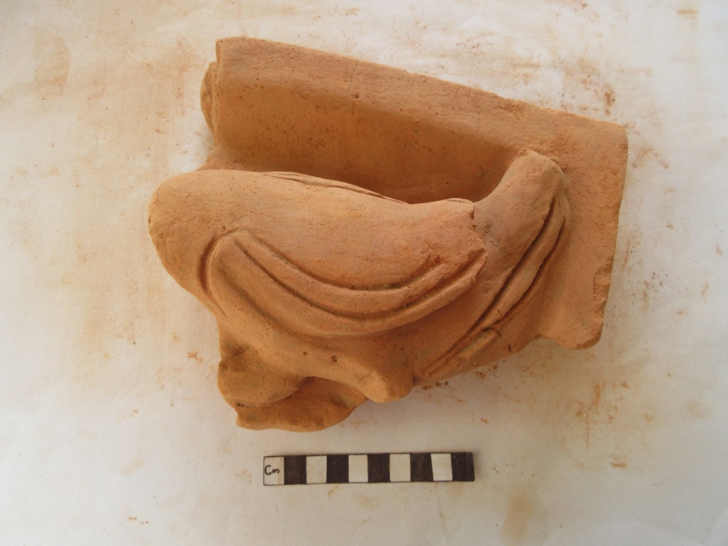 A depiction of bird figure, body portion. Its head and legs are missing.