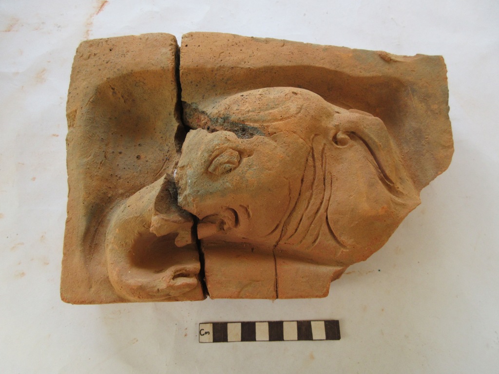 Elephant head figure. It has eye, big ear and open mouth with trunk hanging down, curl back towards the body. Head is broken in 2 pieces.