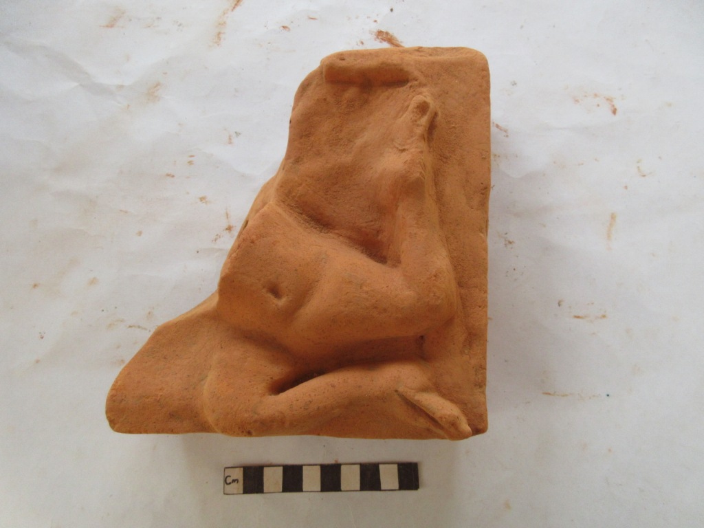 Human figurine, upper portion above waist is missing. Right leg is folded and left leg is raised back, feet pointing towards the sky.