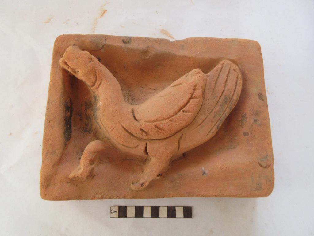 Duck figurine. The figure raised its head, looking up. It open its mouth and having a projected eye. Its right leg is bending and placed forward, left leg is standing in slanting position. Wing part is projected out from the body.