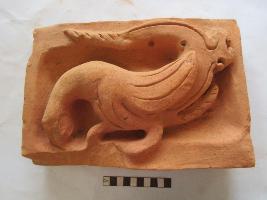 Depiction of peacock. The head of peacock touch to the ground. Head is broken. It has a long tail which is turned forward, over the neck. Wing is slightly projected from the body. Both the legs are clearly depicted. Part of right leg which is placed on the front is broken, left leg is placed on the back.