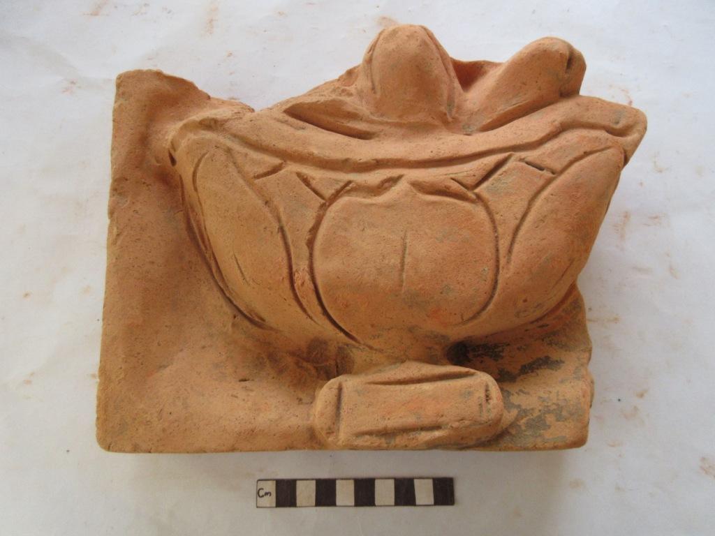 Cup shaped flower vase with rectangular pedestal. A narrow neck connects the vase with pedestal. The vase has design of concave depression in the mouth. The vase holds a flower. Two complete petals are projected outside the vase. One petal on left is broken. The outer surface of the vase is decorated with petal like design