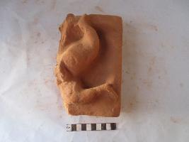 Lower body part of human, below waist . Upper part of body is missing. Left leg is raised up and right is slightly bending. Groin is marked by depression line.