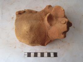 Broken animal figurine. Part of head is broken. It has sharp eye with projected ears. Only half of the body is visible. Legs and tail is missing.