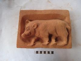 A depiction of pig. The figure faced right direction, open its mouth, having wide open eye, sharp nose and ears. Both right legs are moving forward and the left legs are standing straightly. It has a short tail.