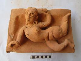 Kinnara flying figure . The figure has big eyes, nose and smiling face, projected ears with kundala on both ears. Left hand is raised near the head, right hand support the body on the ground. Left leg is raised back and right leg is slightly bending. Circular marks on the neck and left arm.