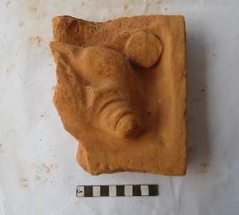 Apertural view of conch shell. The shell has a wide whorled posterior end and a long, slender anterior end. The body in the middle is protruded. Three spiral whorls are visible at the apex. Outer lip overlaps the inner lip. There is a coin like depiction near the conch shell