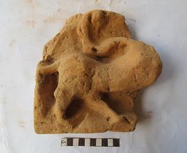 A depiction of mythical figurine. Face and left arm is missing. It has bird arm in the place of right hand and animal hind body with two legs and tail. Left leg is placed on the front and right leg is on behind the left leg.