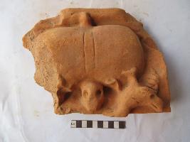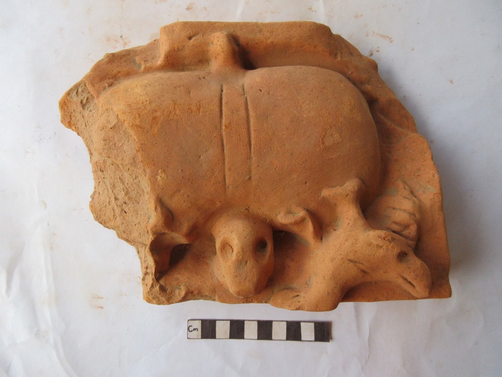Tortoise with bird. The tortoise has deep depression eyes, projected head and tail. Left leg is shown below the bird. Bird is standing on the left shoulder of tortoise, right-side is missing. Incised double lines present on the centre of the tortoise body