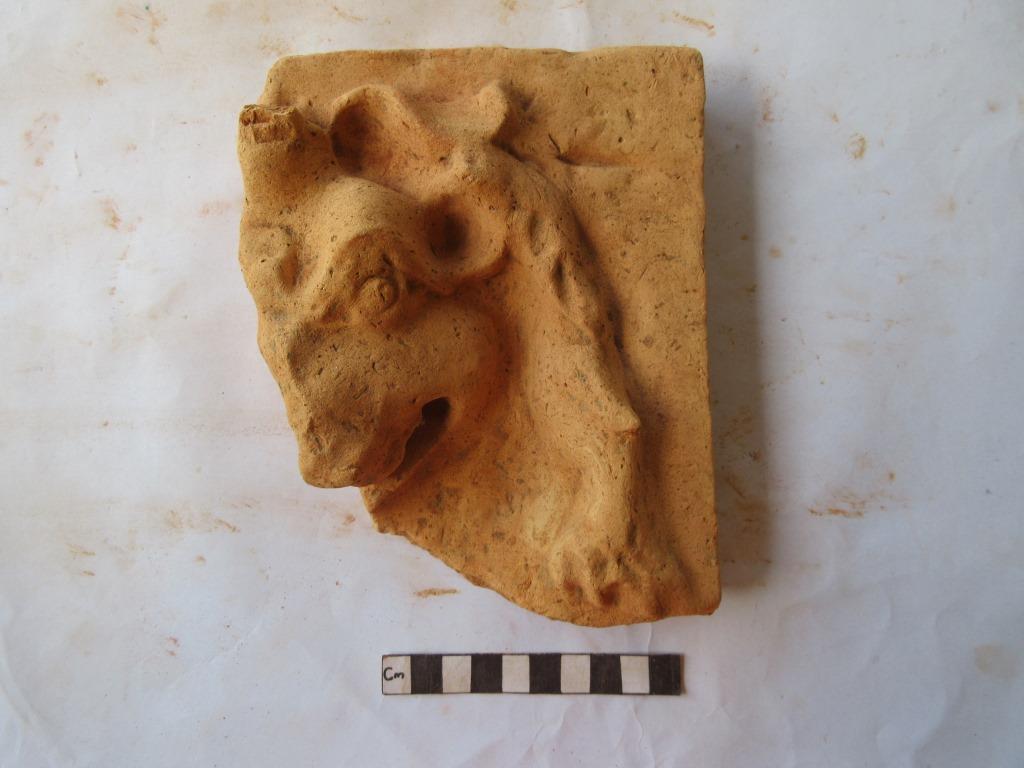 Lion head figure. Half of the face is broken. The figure opens its mouth and only left eye, ear and left front leg is visible. One circular depression above the ear