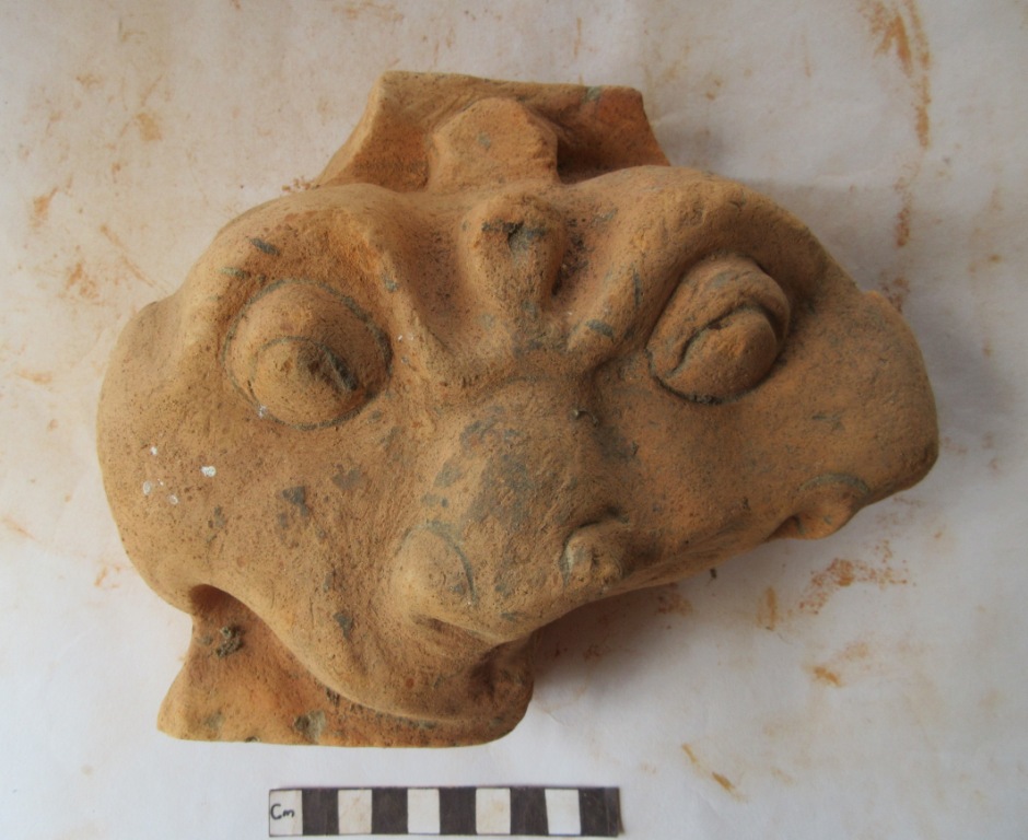 Nasik mukha. The figure has three eyes, sharp nose with open mouth. Broken part of the nose, mouth and head. A projection above the forehead.