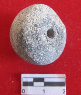Arcanut shape with rough surface. Perforation in center part of object. Use as ornament purpose. Blackish in color. Smooth surface.